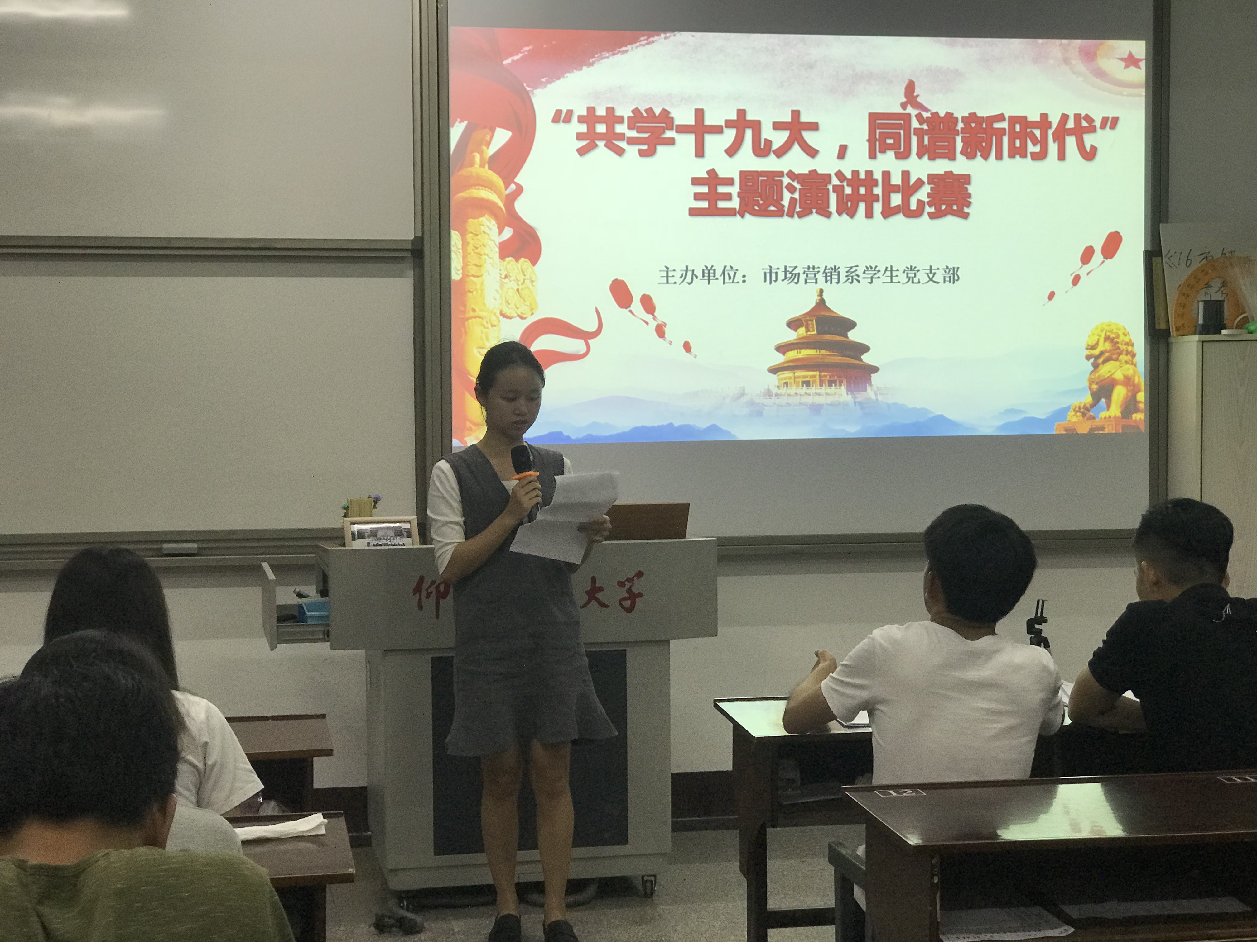 为贯彻学习中国共产党第十九次全国代表大会精神,不断提高党在高校学生中的影响力和凝聚力,激发学生的入党积极性。5月22日晚上7点30分在共和楼324室,市场营销系学生党支部举行“共学十九大,同谱新时代”主题演讲比赛。参加本次演讲比赛的有市场营销系学生党支部书记连景霞老师、市场营销系学生党支部的所有党员以及15级入党积极分子、拟发展对象。