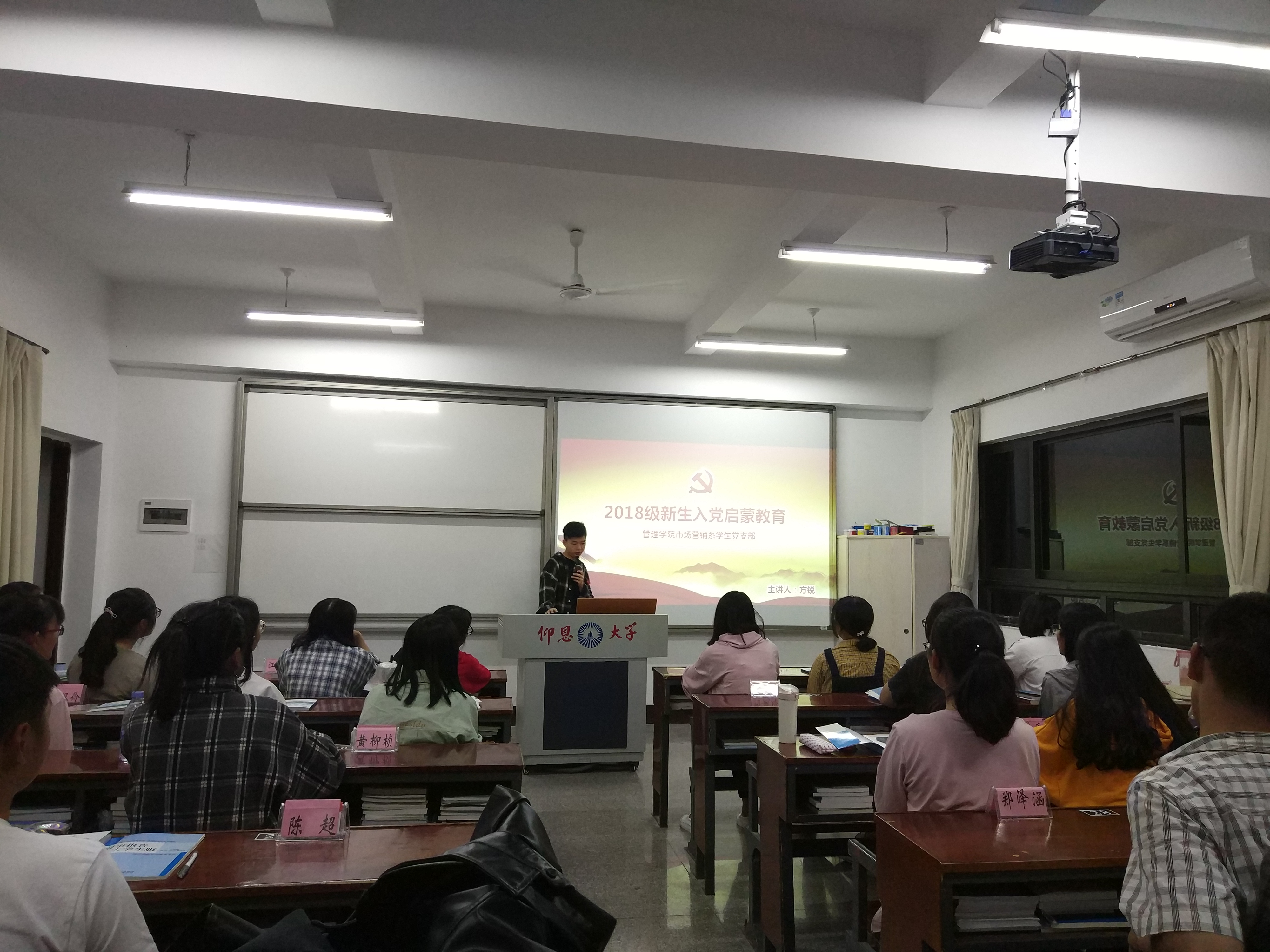 10月10日晚上,市场营销系学生党支部组织党员在2018级市场营销专业新生班级开展新生入党启蒙教育。入党启蒙教育旨在让2018级新生正确看待入党的问题,端正入党动机,详细了解入党的流程及要求。