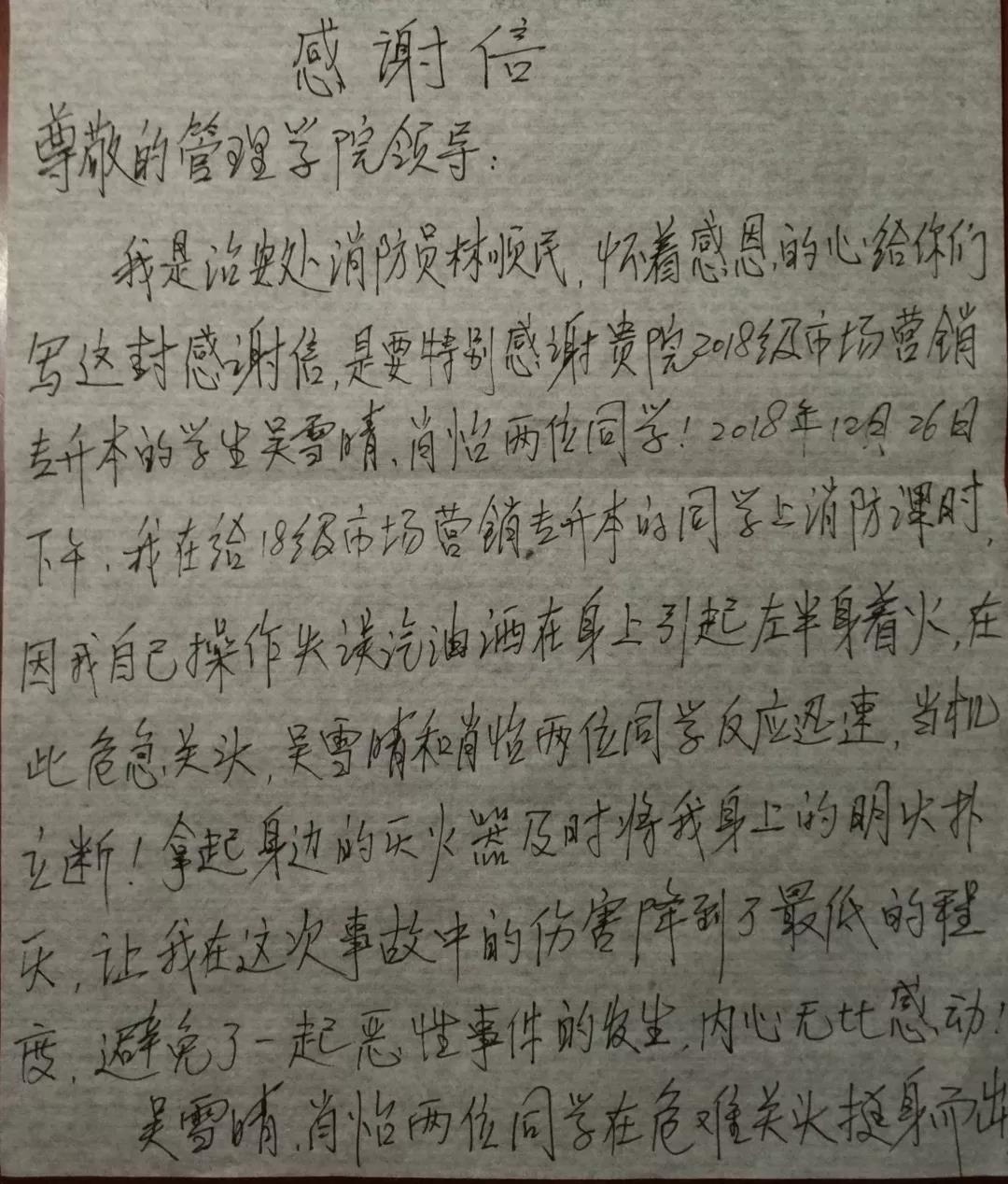 据林顺民描述,12月26日下午,他在给2018级市场营销专升本的学生上消防课的时候,因自身操作失误致使汽油洒在身上引起左半身着火,在此危急关头,吴雪晴和肖怡反应迅速,当机立断拿起身边的灭火器将他身上的明火扑灭,将这次事故的伤害降到了最低的程度,避免了一起恶性事件的发生。为此,他特意给吴雪晴、肖怡两位同学送来了感谢信,以此对两位同学在危难关头挺身而出的行为表达感激之情。