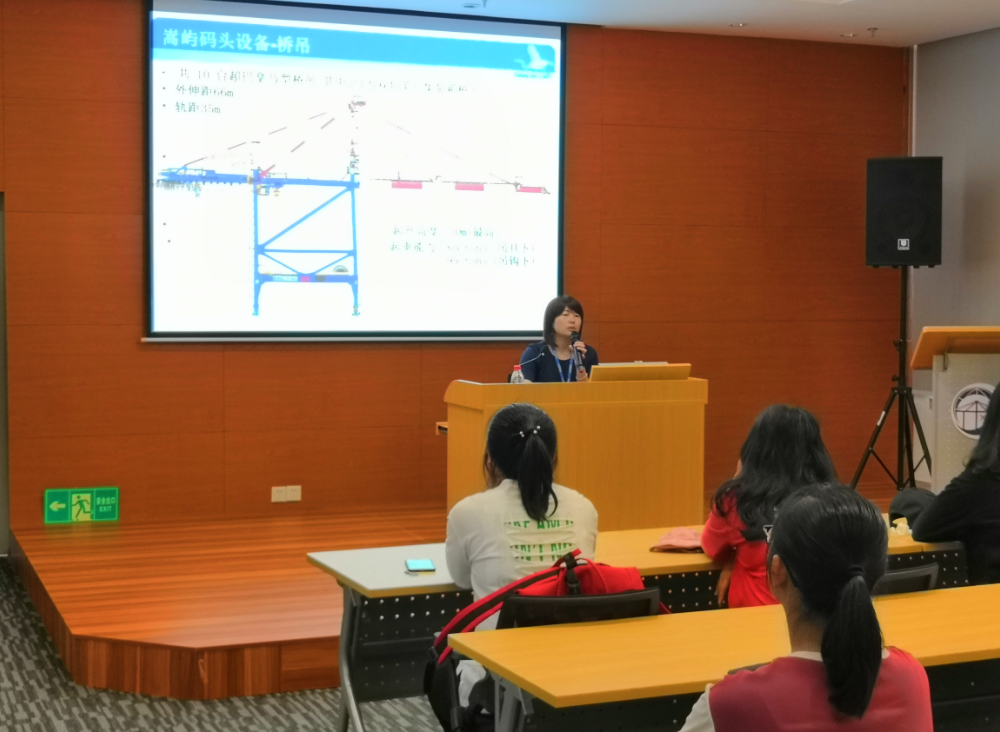 郭环益经理介绍嵩屿码头 嵩屿码头操作部经理郭环益为全体师生详细介绍了厦门港的发展概况、嵩屿码头的发展历程以及码头的机械设备等情况。随后,师生一行与码头工作人员一同乘车深入码头前沿参观,近距离观察码头堆场的布局、机械设备的工作情形。参观完嵩屿码头后,师生们马不停蹄地前往号称“魔鬼码头”的远海集装箱自动化码头参观学习。师生们深入了解了远海码头的发展概况以及自动化双小车岸边集装箱起重机、AGV、轨道吊、自动化集装箱转运平台等设施的运行操作情况。期间,郭经理指出大学生不仅要注重专业知识的学习,更需注重“情商”的培养,她勉励大家从“学做人、学做事”两方面入手,不断提升自身的综合素质。同时,她针对同学们提出的疑问一一进行解答,鼓励大家扎实学识,为将来工作打下坚实的基础。