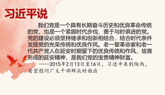 延安曾经是中共中央的所在地,是中国革命的圣地。我们党在延安时期的活动,在党的历史和中国革命的历史上都占有极为重要的地位。习近平同志指出,老一辈革命家和老一代共产党人在延安时期留下的优良传统和作风,培育形成的延安精神,是我们党的宝贵精神财富。今天,全面从严治党要继续从延安精神中汲取力量。要把抓理想信念贯穿始终,提高辩证思维、系统思维能力,保持党同人民群众的血肉联系,始终为党和人民事业艰苦奋斗、不懈奋斗。(来源:人民日报)