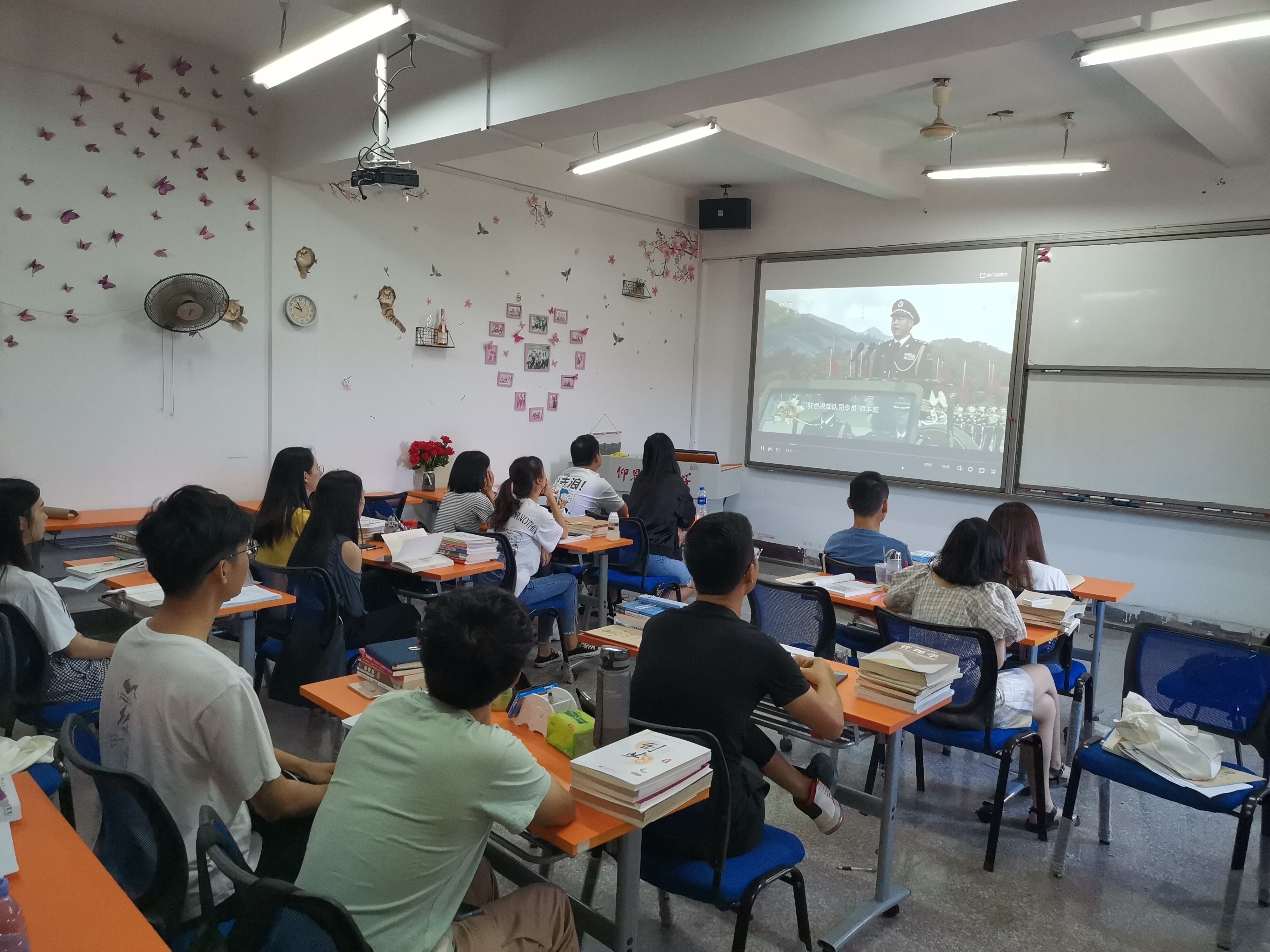 观看国庆阅兵视频 活动开始前,班长陈天元就以“什么是爱国”“为什么要爱国”“作为新时代青年学生,我们应当怎样爱国”等问题展开激烈讨论。讨论过程中,学生们踊跃发言,表达了各自的爱国情怀,同时又形成了一致的爱国共识:为中华之崛起而发愤读书。随后,大家一起观看了往年的国庆阅兵视频。整整齐齐的队列,英姿飒爽的身影,以及一声声礼炮,将同学们的爱国情怀推向高潮。