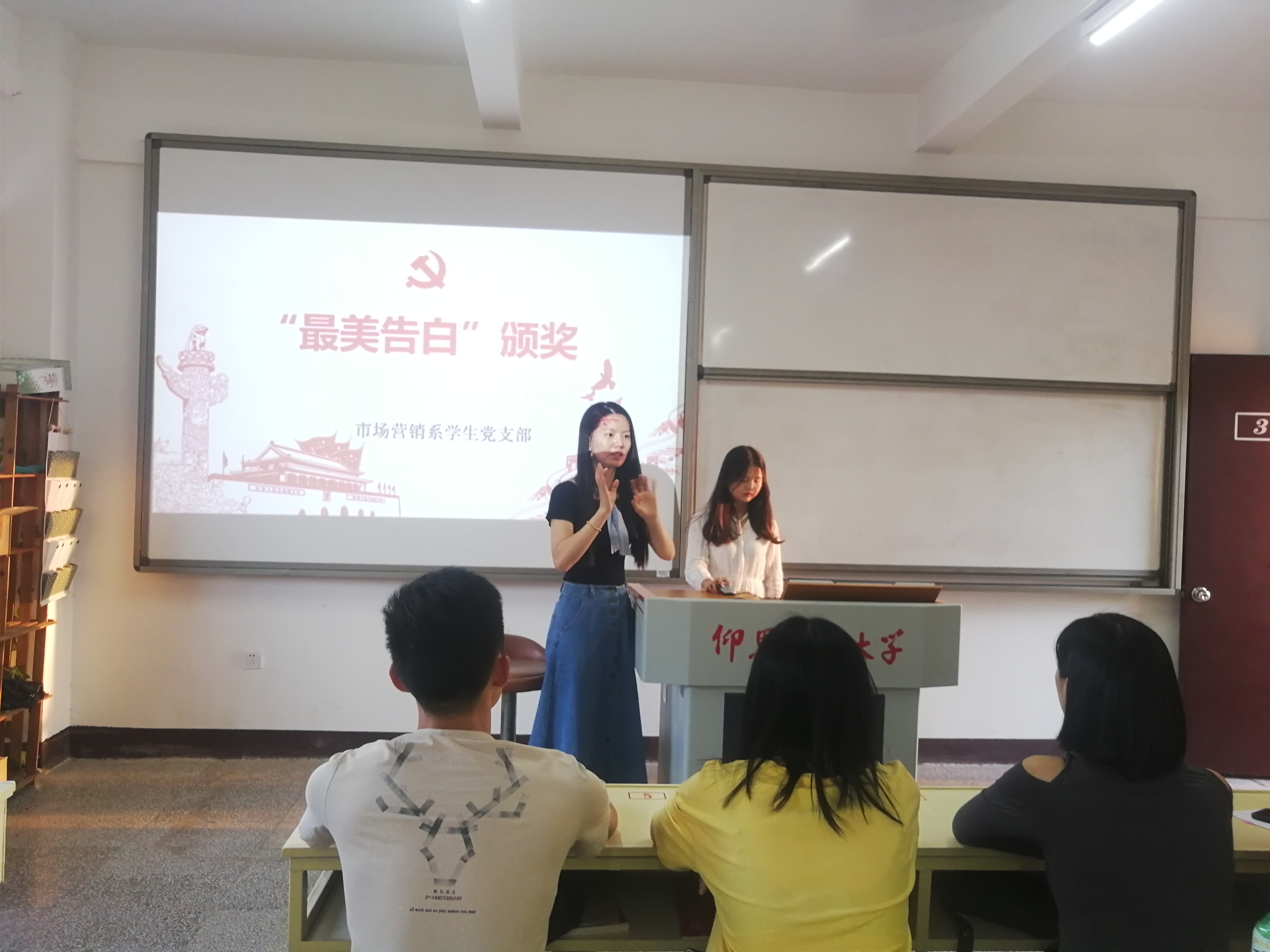 10月18日下午,市场营销系学生党支部在旧区吉龙楼304召开“我爱祖国表白大赛”总结大会。参加本次大会的有连景霞老师以及市场营销系学生党支部全体党员。会议由洪如莹同志主持。
