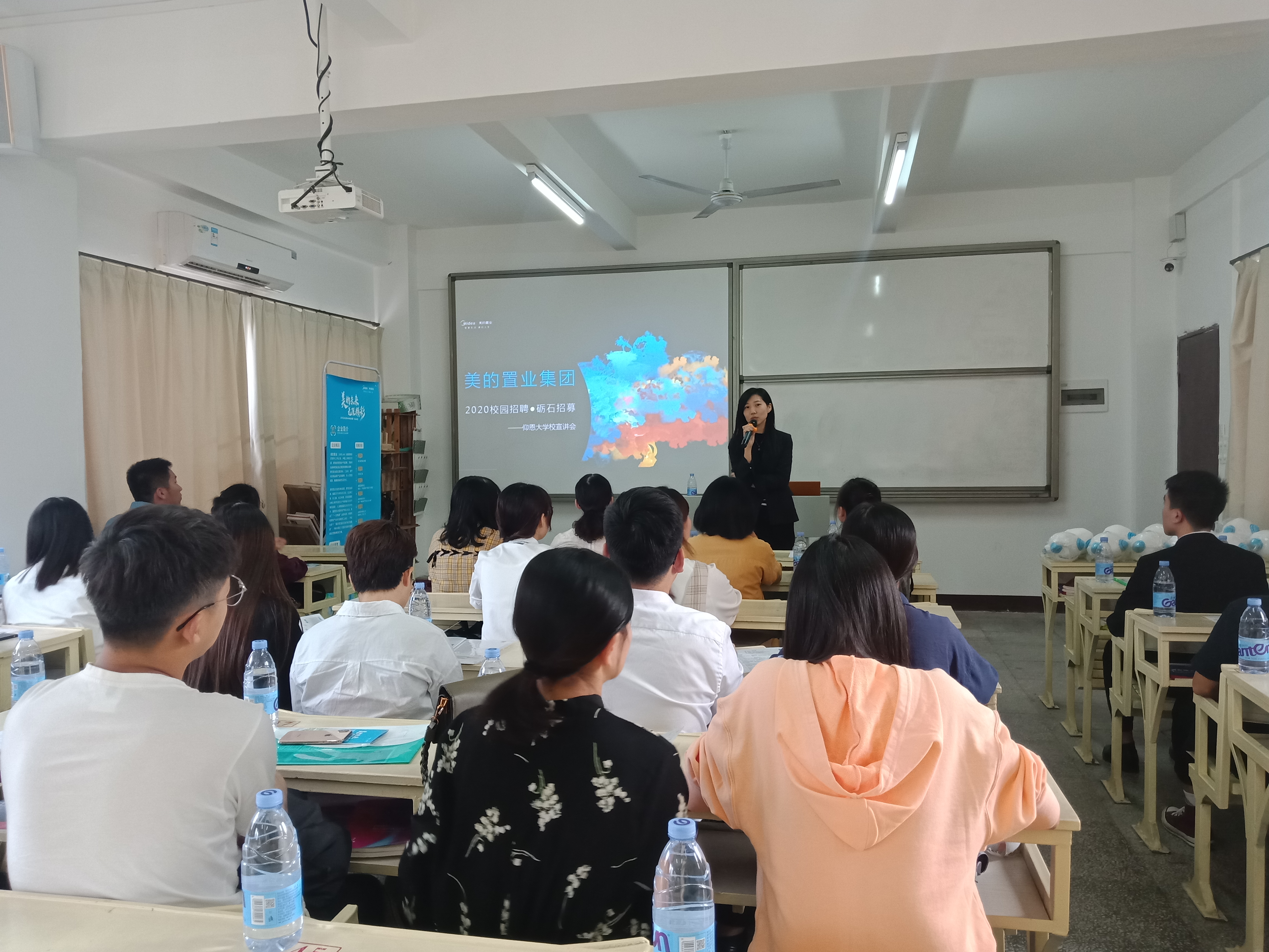 美的置业人事经理宣讲 宣讲会邀请了美的置业赣闽区域招聘负责人孟思彤到场进行宣讲介绍。宣讲会初始,孟思彤女士代表公司对到场的同学们表示了热烈的欢迎和深深的感谢。之后主讲人孟思彤女士为在场的同学们进行美的置业的企业介绍、行业业态分析以及砾石培养计划讲解。互动环节中,面对同学们抛出的疑惑,宣讲人以自身的经历为同学们进行了解答,并分享了在美的置业就职的经验,鼓励同学们积极投递简历,加入美的置业。现场气氛热烈,掌声不断。