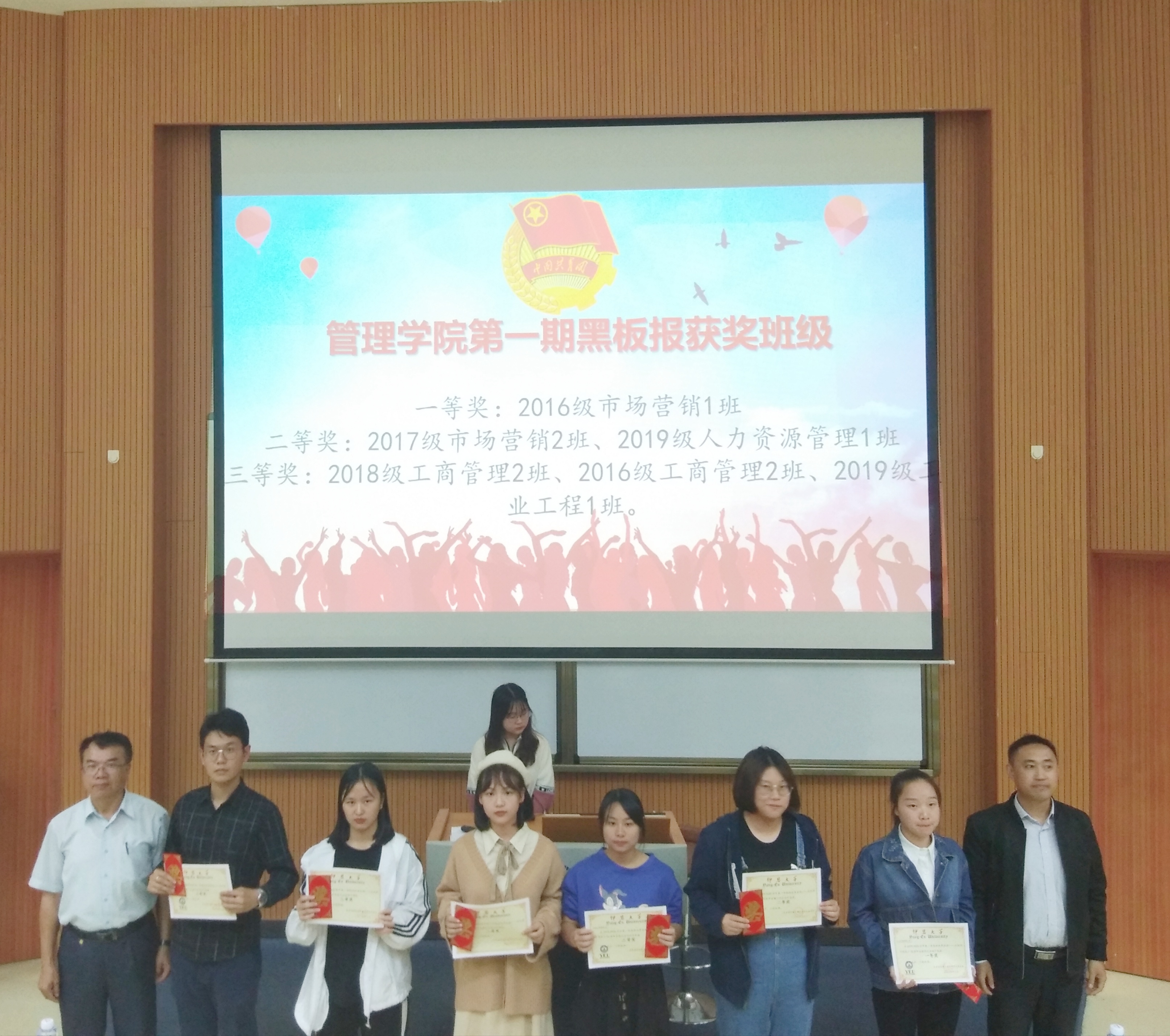 为黑板报优秀班级颁奖 院团委书记杜结实宣读了2019年暑期实践活动优秀团队和先进个人的表彰名单。院领导和各系团总支书记分别为获表彰的集体和个人颁奖。随后,对在永利集团3044第一届课堂笔记大赛学院复赛和2019-2020学年第一期班级黑板报——庆祝新中国成立70周年专题评比中表现突出的集体和个人同时进行颁奖。
