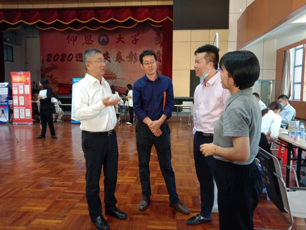 校领导与企业负责人现场交流 我院充分利用学校、学院官方平台进行多维度滚动宣传,提前发布企业招聘信息,此次招聘会45家用人单位共计提供1062个工作岗位,学校近千名在校生前来应聘。此外,按照疫情防控常态化相关要求及时制定校招工作方案和防疫应急处置预案,对用人单位进校及学生参会提出明确要求,实施全程监督,确保活动安全有序进行。