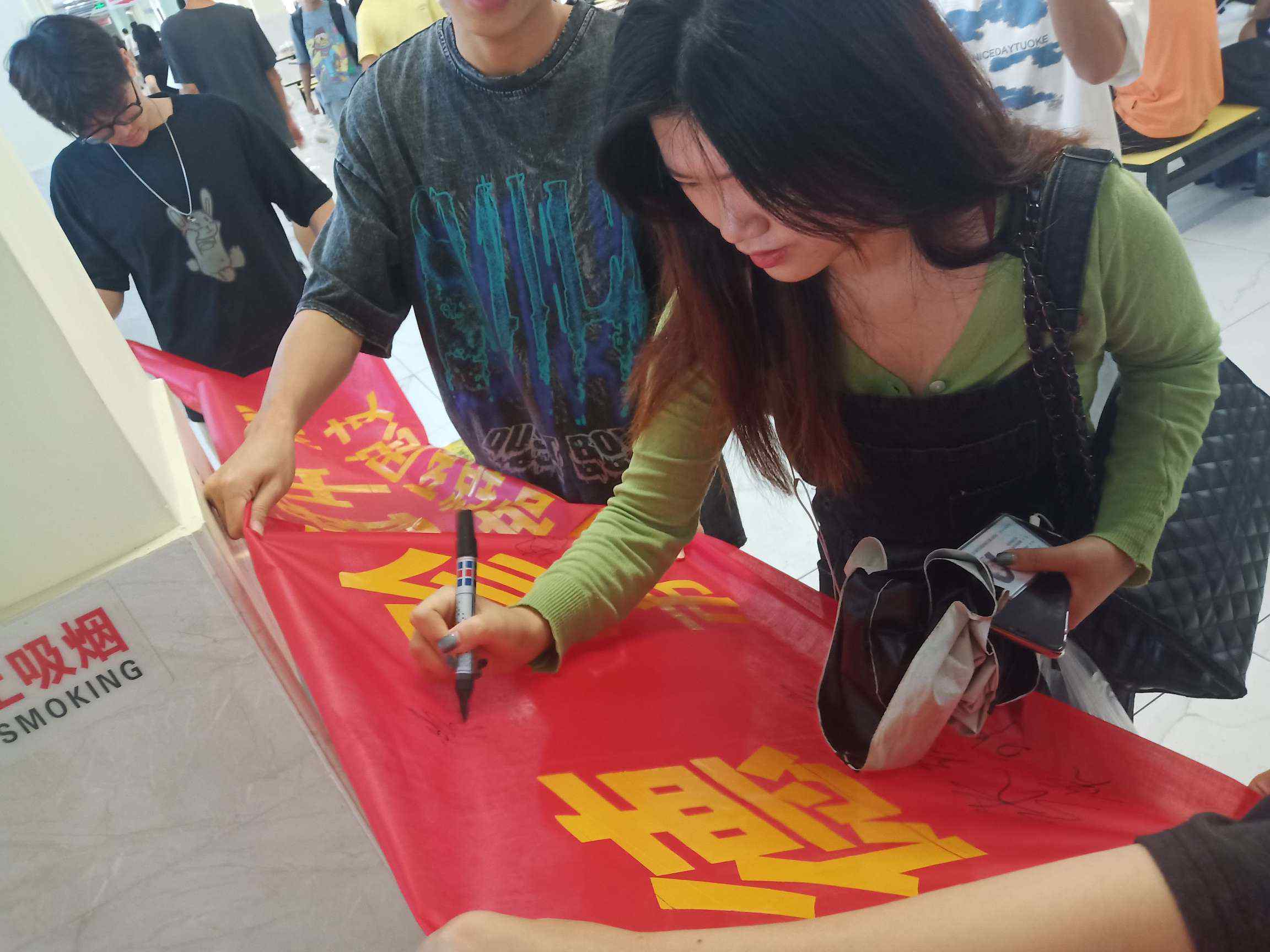 学生签名 本次活动旨在向同学们倡导和宣传节约意识,呼吁同学们抵制粮食浪费行为。在听取了同学们的讲解后,同学们积极参与,不仅在用餐后进行“光盘”拍照并上传至公众平台进行打卡,而且更是积极响应“节约粮食,拒绝‘剩’宴”活动,在横幅上签名。在本次宣传引导下,使得更多同学们一起积极地参与到节约粮食的活动中来,养成良好的行为习惯。