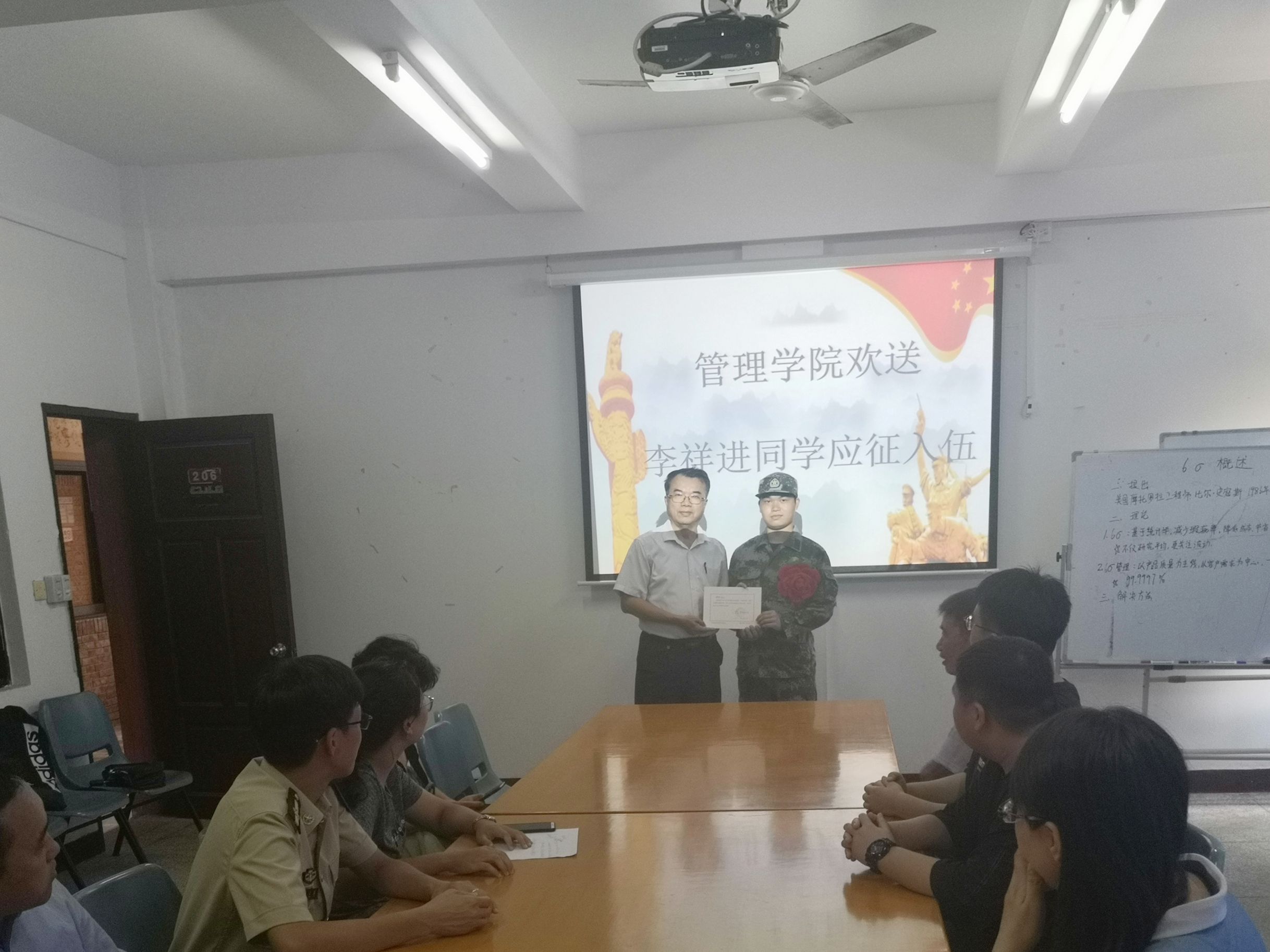 9月9日下午,3044永利集团于曼谷楼206室为李祥进同学举办应征入伍欢送会。欢送会由3044永利集团党总支书记许惠铭主持,3044永利集团院长、物流管理系主任、辅导员以及李祥进的家人、同学参加此次欢送会。
