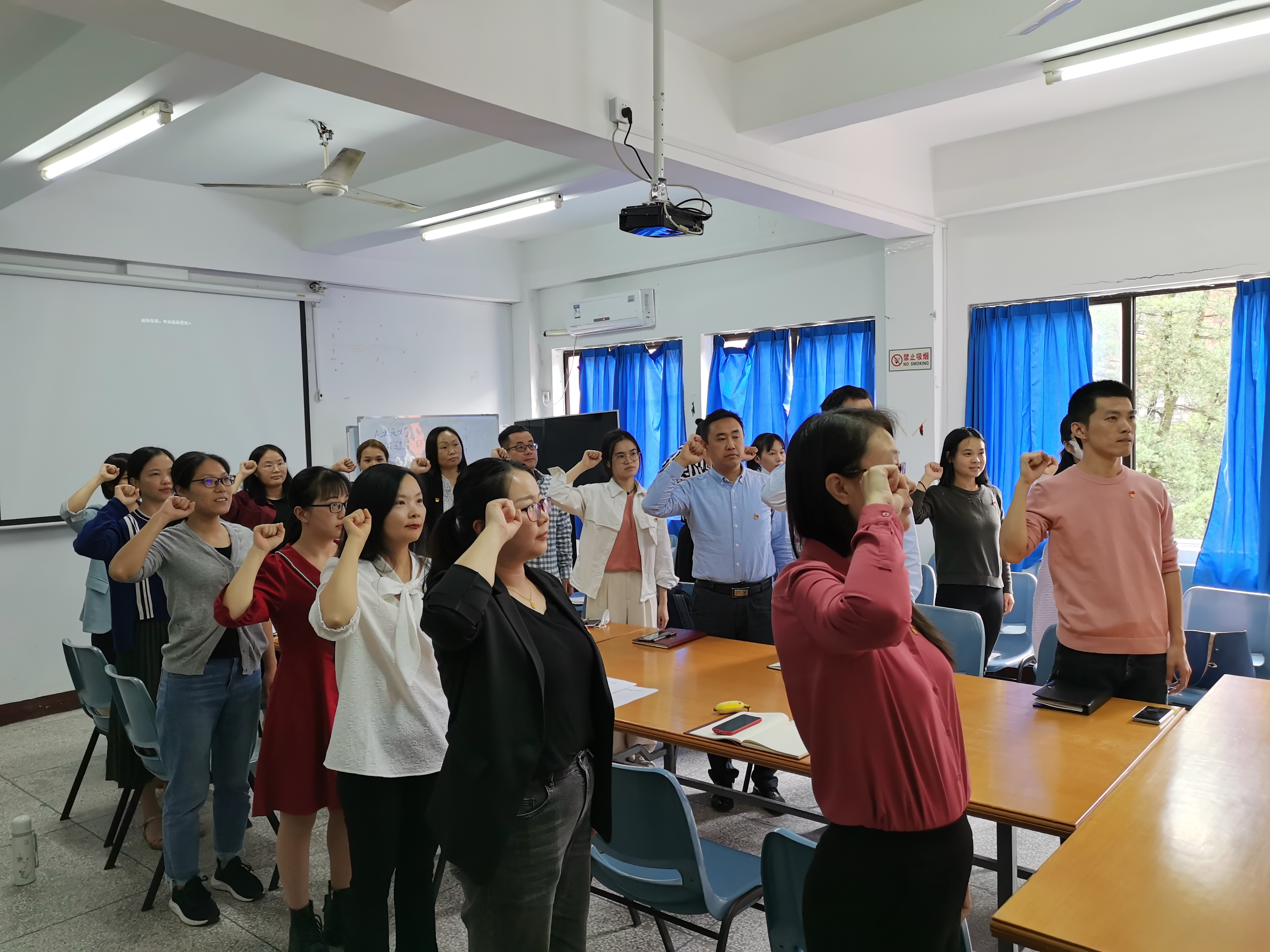 重温誓词 党支部书记李征同志代表新一届支委会发言表态:以习近平新时代中国特色社会主义思想为指导,增强责任感和使命感,充分发挥基层党组织的战斗堡垒作用和党员的模范带头作用,为学院的教学科研等各方面工作服务,以改革创新的精神为学院发展做贡献。(教工党支部王元媚/文图 审核:曾上洪)