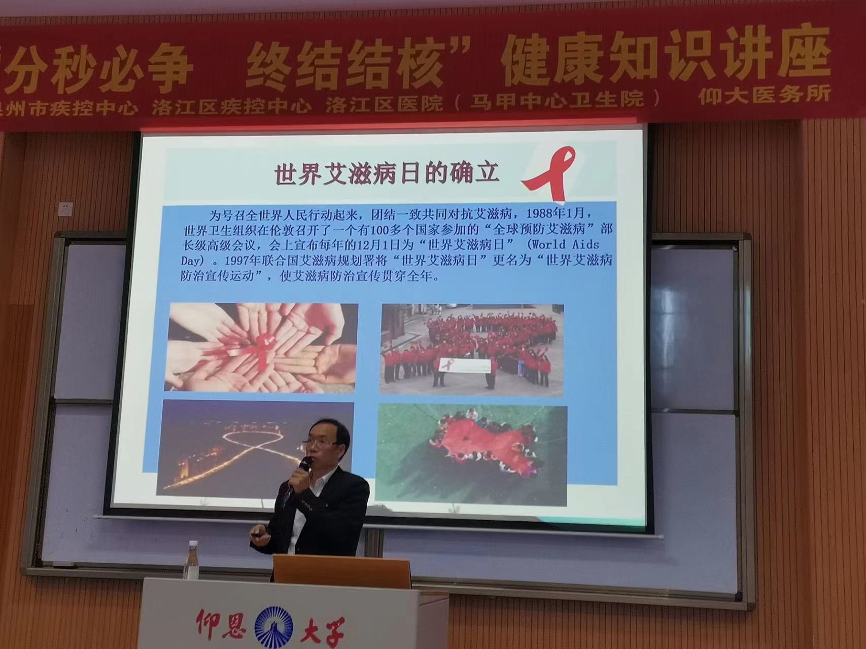 为了贯彻落实国家有关学校艾滋病预防教育工作文件有关要求,宣传防艾知识,提高学生防艾意识,促进学生健康成长。11月24日下午,由泉州市疾控中心许运栋科长主讲的“预防性病艾滋病知识讲座”于永利集团3044第三教学区和昌楼博雅讲堂开展,并由管院各系学子在各班进行宣传,提高学生艾滋病防治知识水平。