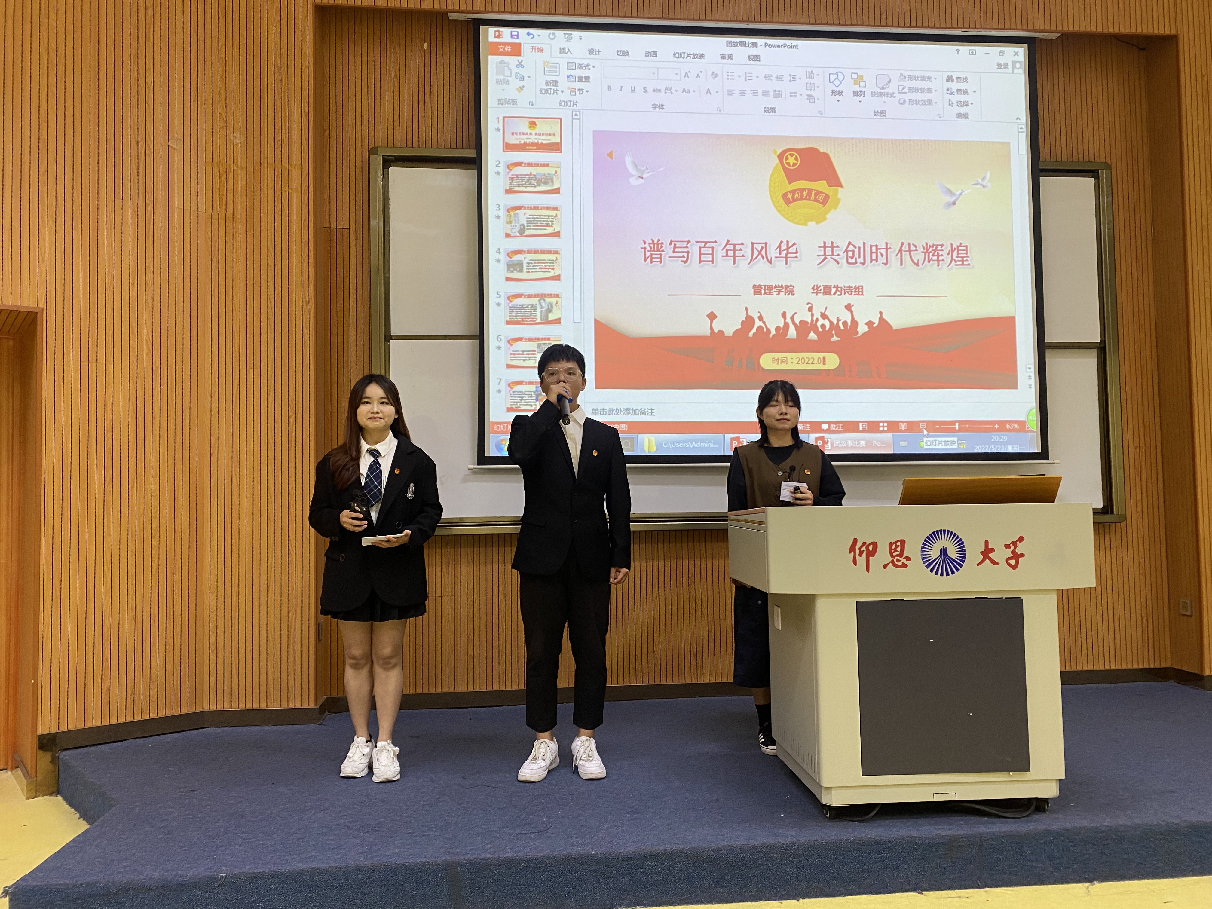 比赛现场 在本次比赛中,来自21工管专升本1班和2班的黄新华、陈诗涵和夏洪材所演讲的《谱写百年风华,共创时代辉煌》,主要围绕着陈延年和陈乔年两位前辈,为我们娓娓道来了一个青年勇担国家大任的悲壮故事,再由故事引出我辈青年的使命担当。而20工管2班的戴梅燕、黄丽丽和21物流1班的陈心仪演讲的《百年团史,青春微光》,则穿越了悠久的历史洪流,带着我们回望中国一路的艰辛和成功,不禁令人心潮澎湃,感触颇深。最终,两支队伍分别获得了一等奖和二等奖的好成绩。