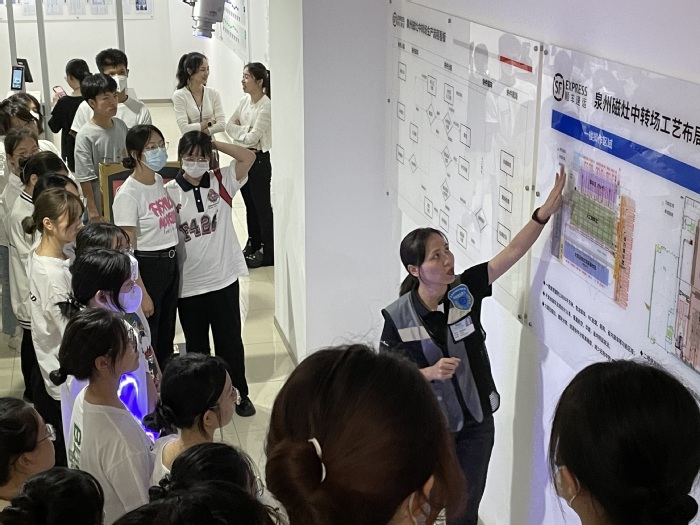 活动伊始,企业负责人苏佳丽围绕顺丰的发展历程、“天网+地网+信息网”及多元业务领域为在场师生作了详尽的介绍,深入了解顺丰是如何利用科技赋能产品创新,为客户提供涵盖多行业、多场景、智能化、一体化的智慧供应链解决方案,让22级学生看到物流行业的广阔天地,增加对于专业的认同感。随后,在中转场负责人带领下,师生深入中转场现场参观学习,进一步了解中转场的工艺布局、自动化设备等,直观感受科技对物流带来的改变。