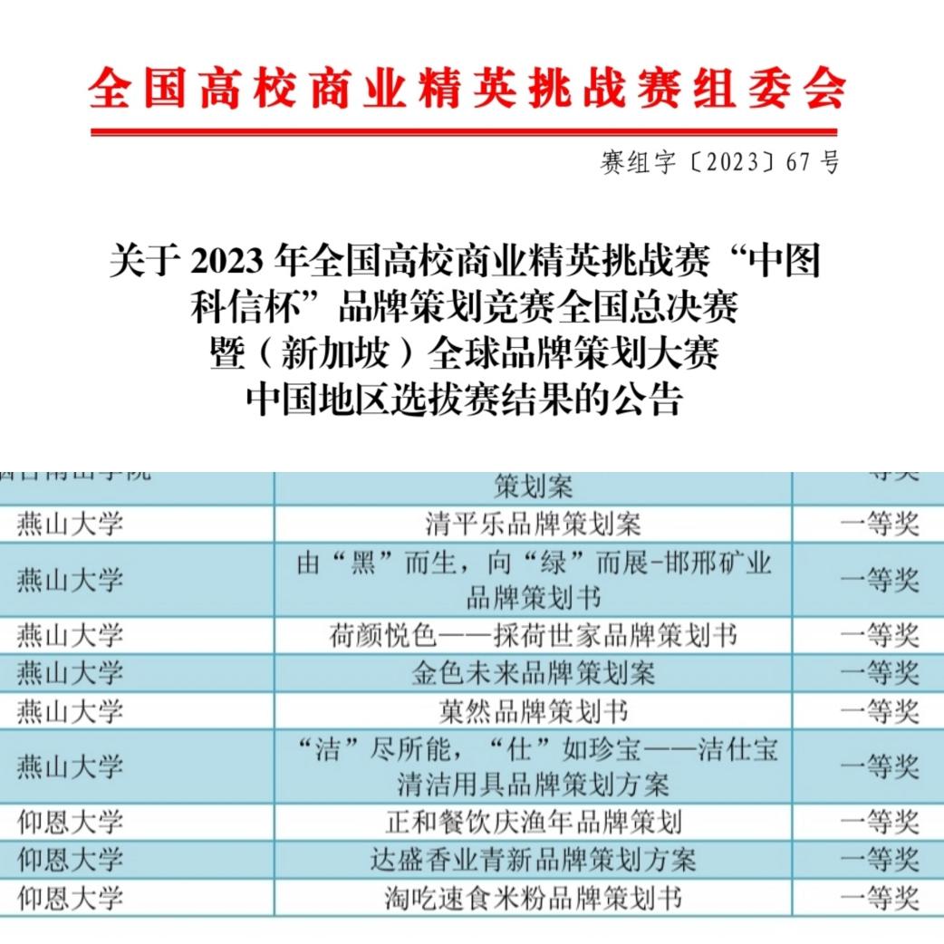 近日,2023年全国高校商业精英挑战赛“中图科信杯”品牌策划竞赛全国总决赛结果揭晓,王元媚、李瑞松指导的三支队伍凭借精妙的品牌方案、生动的视频演示及出色的现场答辩,荣获3个“一等奖”。