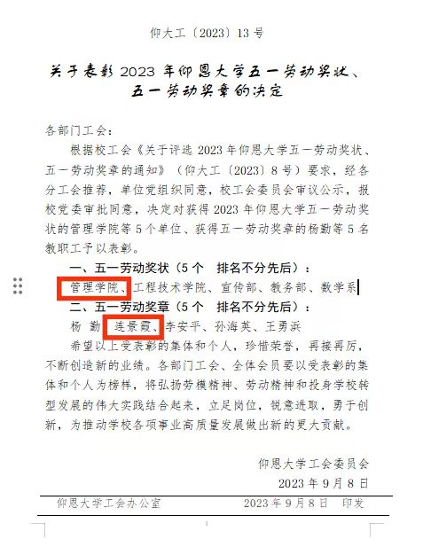 据悉,校五一劳动奖状和五一劳动奖章评选旨在表彰先进、树立典型,营造劳动光荣、知识崇高、人才宝贵、创造伟大的社会风尚,激励广大教职工立足新时代、担当新使命、展现新作为。此次全校有5个单位获得五一劳动奖状,5位老师获得五一劳动奖章。接下来,我院将珍惜荣誉,再接再厉,不断创造新的业绩!