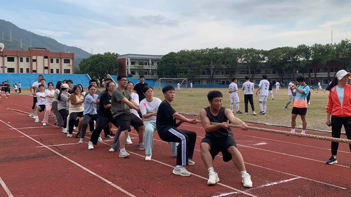 当比赛哨声一响起,运动员们口中一起高喊着“一二,一二”,双手紧握长绳,卯足了劲拼命往后拉,努力拼搏,富有节奏的呐喊声、加油声,充斥在操场上空,久久回荡。比赛过程中,双方战况焦灼,胜负难分,市销学子毫不退却,咬紧牙关,坚持到底。赛场上的队员个个斗志昂扬,他们用汗水阐述了团结的含义,他们顽强的毅力与拼搏的精神令人感动。现场拉拉队的同学们个个热情高涨,呐喊助威给比赛增添了一抹亮色,每一声呐喊都为参赛队员们带来力量。最终,市场营销系在拔河比赛荣获校级第一名的优异成绩!