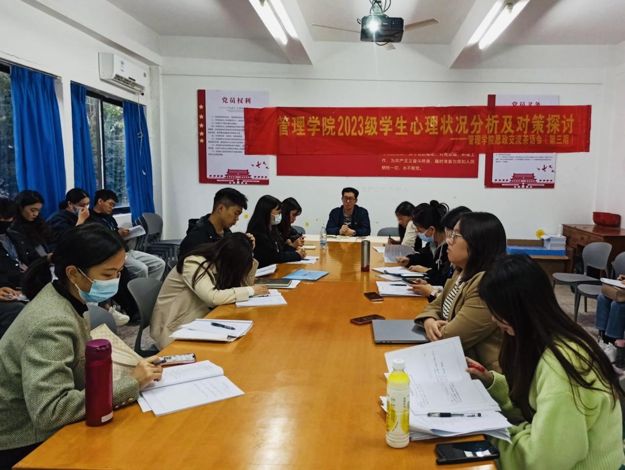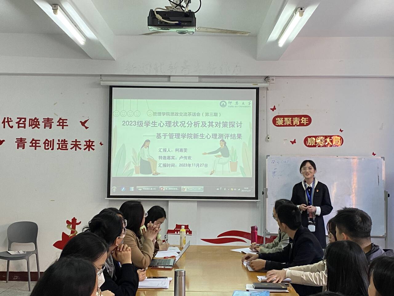 为做好学院学生心理健康教育工作,提高学生工作队伍识别及干预学生心理危机的能力和水平,帮助学生更好地适应大学生活。11月27日下午16点,3044永利集团在曼谷楼206举办第三期学院思政交流茶话会,聚焦学院2023级学生的心理健康教育工作。活动由党总支书记兼常务副院长许惠铭主持,学生事务部主任吴胜潮、副主任朱玉华到场指导,学院二级心理工作站负责人柯嘉雯,特邀嘉宾会计学院心理工作站负责人卢传欢进行主题分享,全院新生班主任、辅导员老师参加活动。