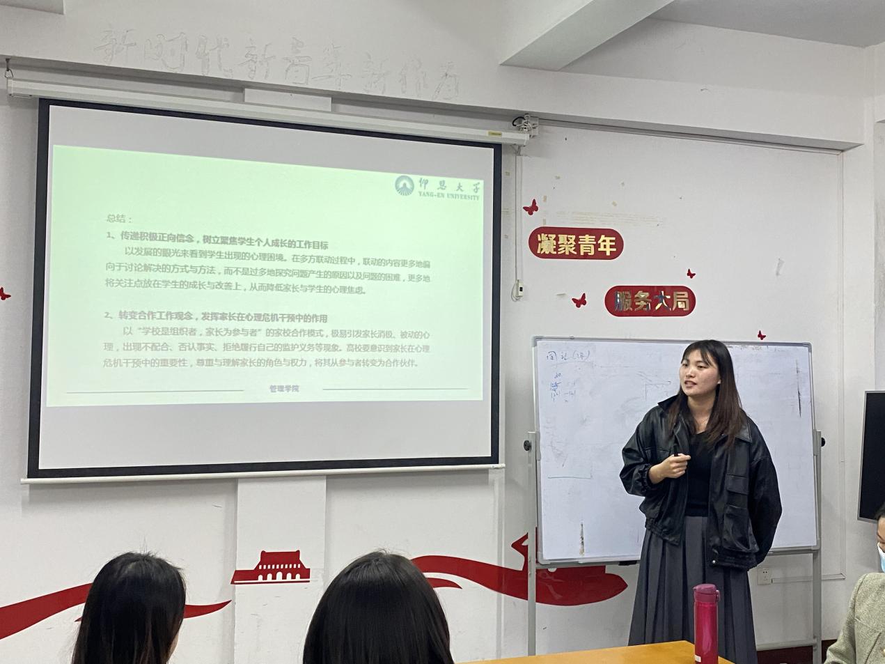 柯嘉雯老师结合3044永利集团2023级学生的心理测评结果,围绕测评结果统计、测评结果显示突出的问题、对学生心理问题干预的谈话技术三个方面进行展开分享,有效提高了班主任和辅导员们识别及干预学生心理危机的能力和水平。
