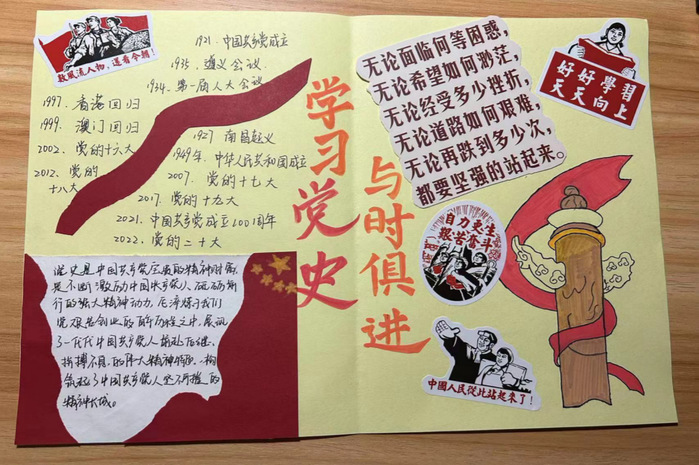 当代中国青年是与新时代同向同行、共同前进的一代,生逢盛世,肩负重任。广大青年要爱国爱党,在党史学习中不断激发信仰、增强骨气,不断坚定“四个自信”,不断增强做中国人的志气、骨气、底气,立志成为一名有理想、敢担当、能吃苦、肯奋斗的新时代青年,并树立为祖国为人民永久奋斗、赤诚奉献的坚定理想。所以为了加强党史的学习教育,厚植爱党爱国情怀,物流管理系学生党支部组织支部成员学习党史,通过制作手账这一新颖别致的方式,激励支部成员们不忘先辈建党初心,展望未来砥砺前行。