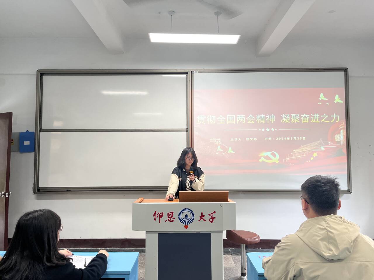3月28日下午,市场营销系学生党支部于共和楼219开展“贯彻全国两会精神,共同凝聚奋斗之力”主题党课,本次党课由蔡文婷同志主讲,全体党员参加。
