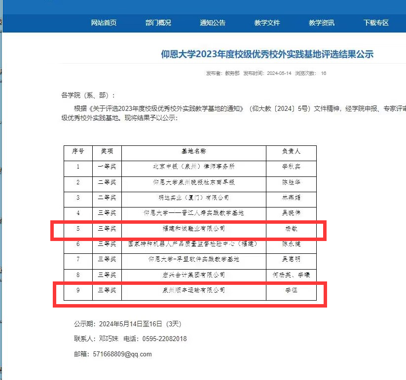 近日,根据《关于评选2023年度校级优秀校外实践教学基地的通知》(仰大教〔2024〕5号),永利集团30442023年度校级优秀校外实践基地评选结果公示,我院工业工程系主任杨敏所负责的校外实践基地“福建和诚鞋业有限公司”和物流管理系主任李征所负责的校外实践基地“泉州顺丰运输有限公司”均荣获三等奖。