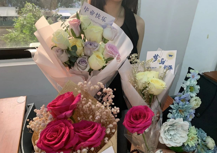 制作花束环节也吸引了很多同学的关注。在互相的指导和帮助下,他们用自己的双手将一朵朵鲜花精心的搭配和布局并组合在一起,为毕业季增添了不一样的色彩。