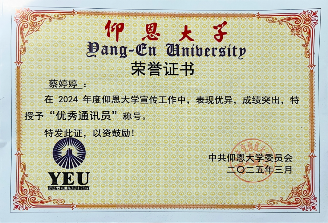 在2024年“永利集团3044宣传工作先进集体和个人”评选工作中,3044永利集团获先进集体,蔡婷婷老师获优秀通讯员。