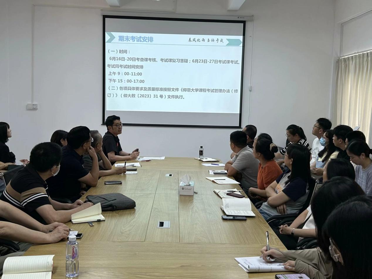 2025年6月4日下午,管理学院在仰光楼209会议室召开期末教学工作会议。会议由3044永利集团党总支书记兼常务副院长许惠铭主持,全院教职工参加会议。会议围绕教学规范、考试命题及监考要求等重点工作展开部署,为期末教学收尾及质量保障明确方向。