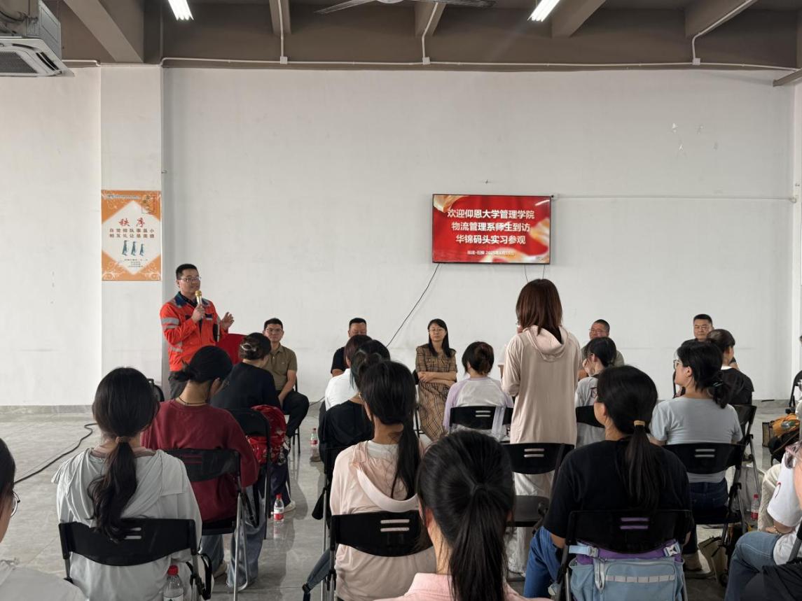 在码头技术部、操作部负责人的引导下,师生深入作业一线。负责人以码头总体规划布局为切入点,详解泊位功能,帮助师生构建宏观港口物流的认知框架。随后实地观摩大型集装箱起重机、自动化堆场设备作业,技术人员围绕设备机械结构、智能控制系统运行原理及安全生产规范展开现场教学,通过“理论原理剖析+设备实操演示”的双轨模式,实现理论与实践深度融合;在智能化调度中心,通过实时数据可视化系统沉浸式观摩船舶调度与货物转运全流程,切身感受数字化技术对物流效率的的革命性赋能效应。