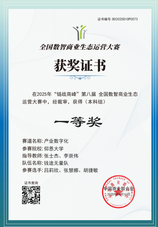 此次获奖不仅是对参赛团队成员学术素养与实践能力的双重肯定,更彰显了我院在数智商业教育领域的深厚实力与强劲竞争力。一直以来,我院高度重视学生实践能力和创新精神的培养,积极为学生搭建各类实践平台,鼓励学生参与各类学科竞赛。此次大赛佳绩的取得,将进一步激发我院学子的学习热情和创新活力,激励更多学生投身到数智商业领域的学习与实践中。