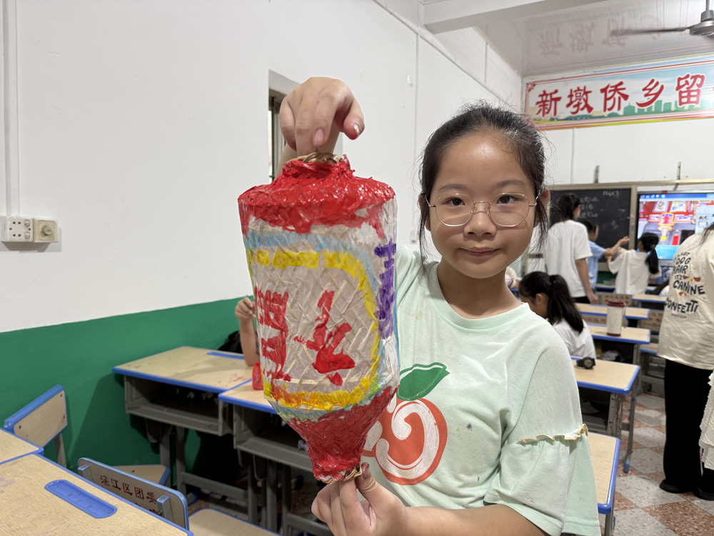 活动现场,实践队员沈如钰详细讲解了油纸灯笼的历史渊源、制作方法和技巧。从挑选合适的竹篾编织骨架,到将薄而坚韧的油纸小心翼翼地粘贴在骨架上,再到绘制精美的图案进行装饰,每一个步骤都蕴含着独特的韵味和讲究。讲堂上孩子们认真聆听,积极互动。小朋友们在实践队员的协助下,发挥天马行空的想象力,用画笔在油纸上勾勒出有趣的线条,写下美好的祝福语,承载着孩子们对生活的美好期许,更成为了传统文化传承的载体。