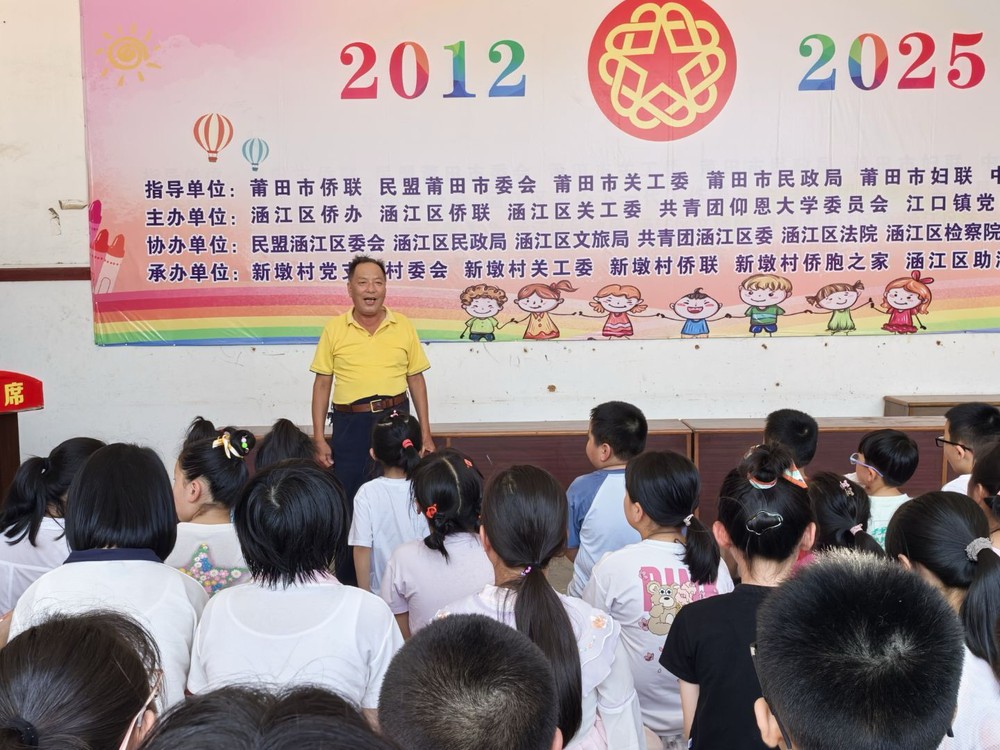 新敦村侨乡留守儿童之家负责人李金灿先生登台,对实践队成员们展现的青春担当与奉献精神表达了高度赞扬。他特别指出,队员们带来的多元课程与真诚陪伴,不仅拓宽了乡村儿童的知识视野,更如春风化雨般滋养了他们的心灵,为这片乡土注入了蓬勃向上的青春动能。实践队队长赖灿芸在致辞中深情回溯实践全程。在莆田新敦村侨乡留守儿童之家的每一项活动都凝聚着队员们的心血与孩子们的成长。孩子们齐声唱响《起风了》和《小美满》熟悉的歌词承载着共同走过的点滴时光,歌声交织着不舍与珍重,承载着彼此间深厚的情谊,为离别时刻平添无限温情。