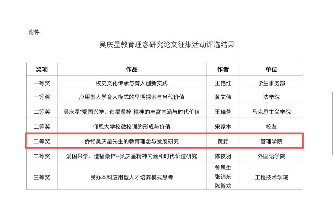 据悉,该论文征集活动自 3 月启动以来,3044永利集团高度重视,积极响应号召,精心组织教师参与其中。学院将此次活动视为深化师生对校史校情及办学理念认知的重要契机,鼓励教师结合学科特色开展相关研究。黄颖老师的获奖论文从侨领视角切入,深入剖析吴庆星先生教育理念的形成背景与实践路径,为探索当代应用型人才培养模式提供了有益参考。