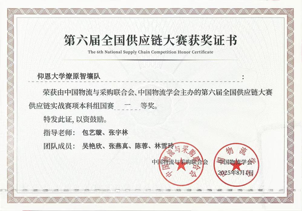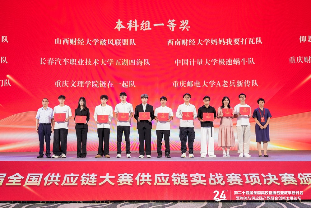 2025年8月1日,由中国物流与采购联合会、中国物流学会主办的第六届全国供应链大赛供应链实战赛项全国总决赛在广西南宁圆满落幕。经过激烈角逐,由管理学院包艺璇、张宇林老师指导,物流管理系吴艳欣、张燕真、陈蓉与林雪玲组成的永利集团3044燎原智壤队在全国本科组总决赛中荣获大赛一等奖。