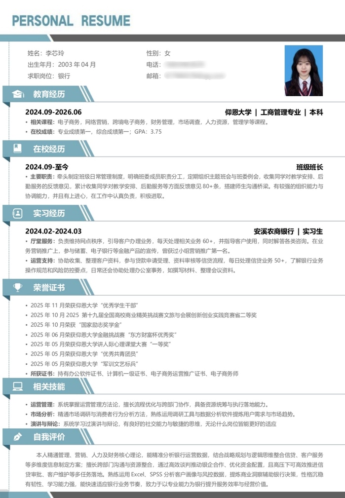 评审环节邀请人力资源系专业教师组成评审团,围绕简历结构完整性、内容针对性、语言简洁度、设计美观度等维度进行综合打分,且同时开设线上投票环节,邀请师生共同参与评选。获奖作品不仅呈现学业成果、实践经历,又融入个性化职业认知,充分展现管院学子的职场潜力。最终,李芯玲同学荣获一等奖,林金莉、蔡晓敏、吴怡帆同学获得二等奖,林佳欣、林嘉希、林震菲、林琪琪、邓凌楠获得三等奖,王倩雯、林嘉怡、孙昌锋获得优秀奖。
