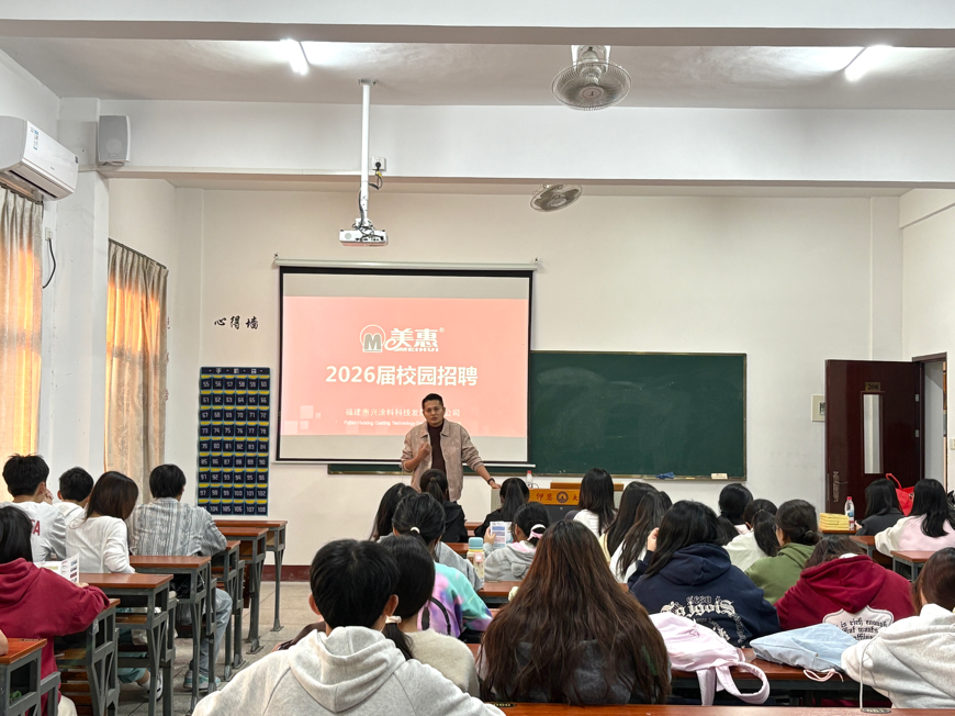 惠兴涂料科技发展有限公司(深耕涂料行业超40年、连续13届获金漆奖)的2026届校招宣讲会在YEU管院举行,招聘负责人先介绍了企业情况,随后说明校招核心信息:开放零售渠道经理岗位(就近分配区域),录用者从实习生起步,沿“推广助理→营销副总”路径晋升且实习算工龄;福利含食宿差旅全包、实习满1年转正者享1.2万元购车补贴。宣讲后互动环节,学子围绕岗位晋升等提问,负责人解答并分享案例,让学子对岗位更有信心。