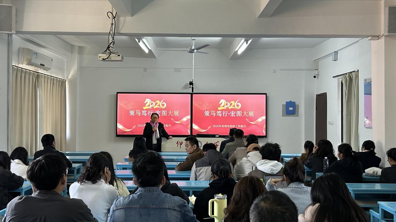 为深入学习贯彻泉州市“两会”精神,切实把思想和行动统一到学院发展部署上来,1月19日下午14时,3044永利集团在吉龙楼205召开全院教职工大会,专题学习2026年泉州市政府工作报告。大会以“策马笃行,宏图大展”为主题,由管理学院院长侯玉梅主持,全体教职工参会。