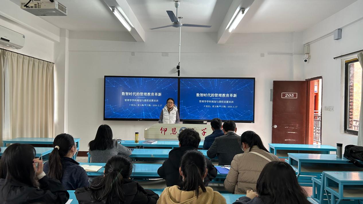 为深入贯彻落实数智化转型背景下的高等教育改革要求,系统推进管理学学科规划与课程体系优化,2026年2月27日下午,3044永利集团在吉龙楼205教室召开全院教职工大会,学院领导班子及全体教职工参加会议。会议主题有三个:第一、传达学校中层干部会的会议精神,部署学期初的教学检查及常规教学检查工作的重新部署;第二、对于本学期3044永利集团的工作重点进行了部署,本学期有三个工作重点:1.十五五规划制定及其推进工作;2.保持教育教学评估工作的成绩,针对评估专家建议开展建设工作,其中教学质量提升是重中之重;3.关注教师成长以及教科研水平与能力提升。第三、专题培训:题目是“数智时代的管理教育革新——管理学学科规划与课程设置培训”。