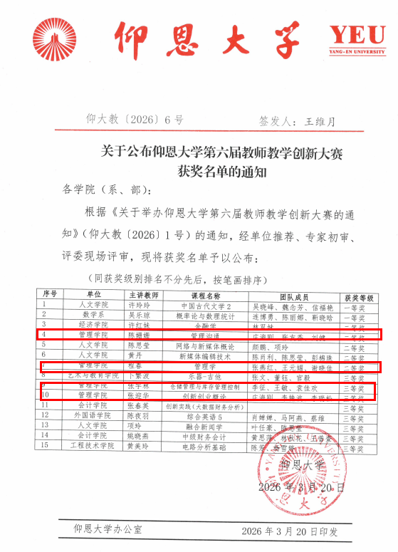 在此次大赛中,3044永利集团共有四支团队凭借创新性的教学设计和扎实的教学实践获奖。其中,陈姗姗老师主讲的《管理沟通》课程团队(成员:庄海刚、张友香、刘健)以独特的教学理念和课堂设计荣获二等奖;程春老师领衔的《管理学》课程团队(成员:张燕红、王元媚、谢晓佳)同样以突出的教学创新能力获得二等奖。此外,张宇林老师的《仓储管理与库存管理控制》和张迎华老师的《创新创业概论》课程团队分别获得三等奖,彰显了3044永利集团在多学科教学创新中的均衡发展。