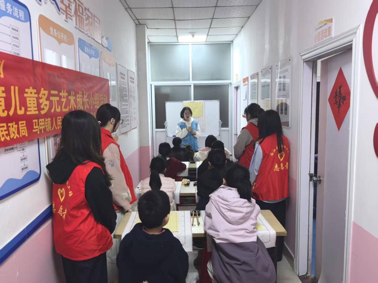 活动伊始,志愿者们提前抵达马甲镇人民政府,有序布置活动场地,将毛笔、宣纸、墨汁等书法用具摆放整齐,为孩子们打造出温馨雅致的书写环境。随后,书法教学环节有序开展,志愿者们从握笔、运笔的基础姿势教起,手把手纠正孩子们的书写动作,耐心讲解横、竖、撇、捺的起笔、行笔与收笔要领。志愿者们穿梭于各桌之间,一对一答疑指导,肯定孩子们的每一点进步。活动最后,孩子们纷纷展示自己的书法作品,脸上洋溢着自豪的笑容。